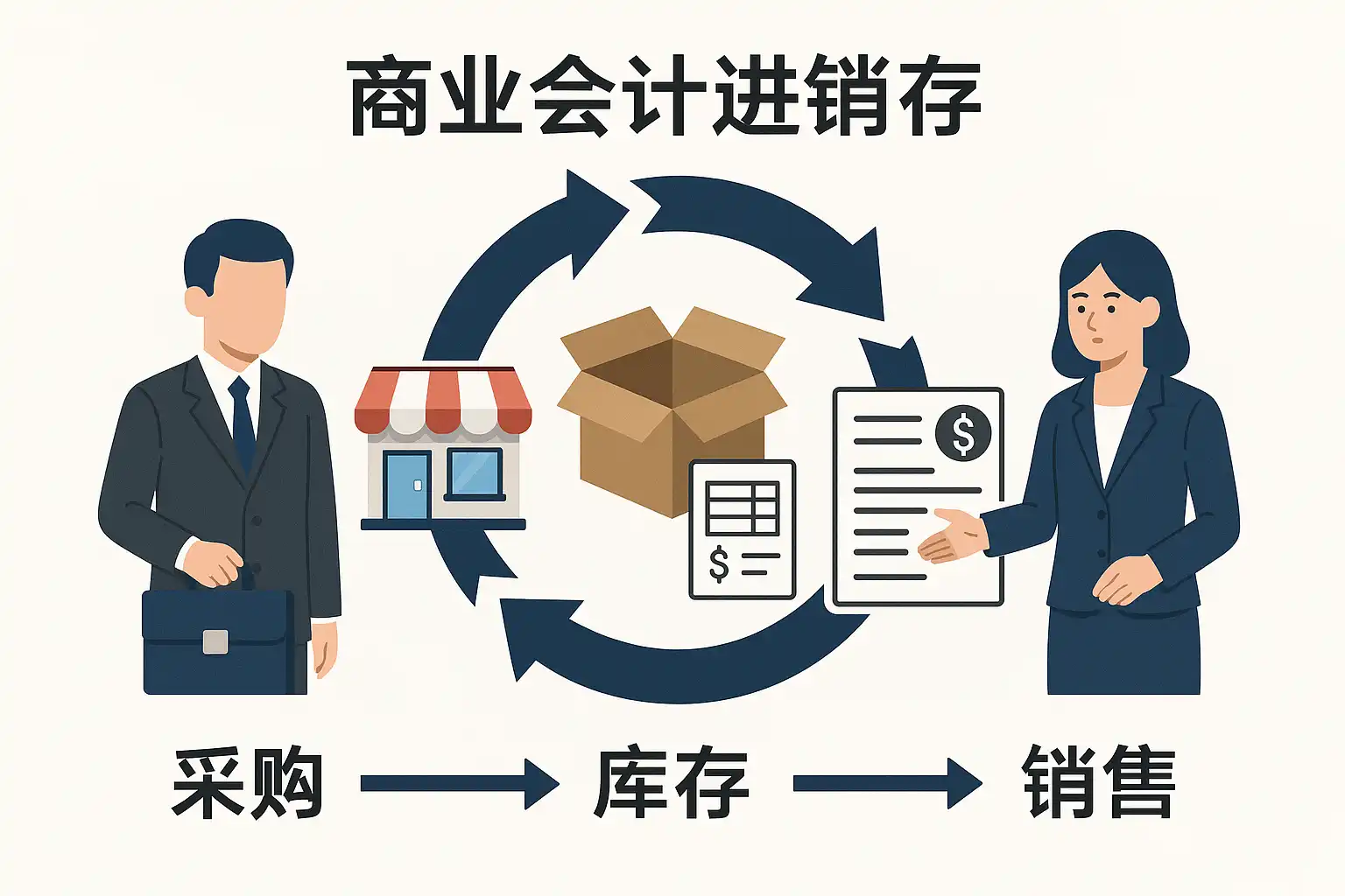 商业会计中进销存管理涵盖了商品从采购到最终销售以及库存管理的完整链条。其核心流程如下: