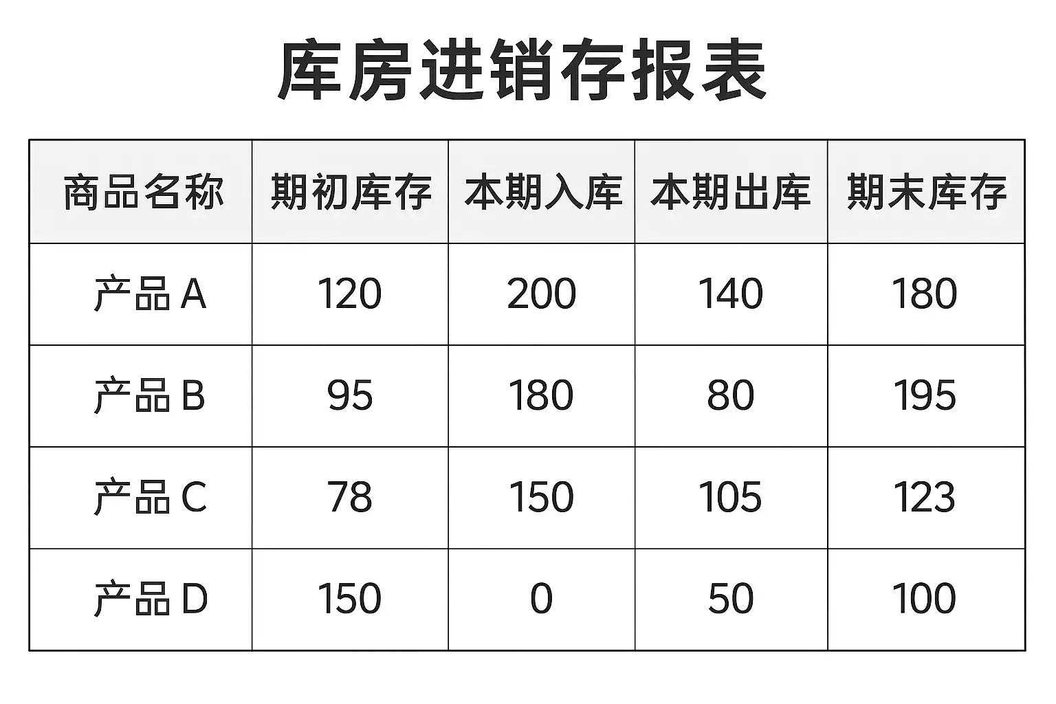 - 库存数据:包括期初库存、入库数量、出库数量和期末库存,确保库存信息准确。