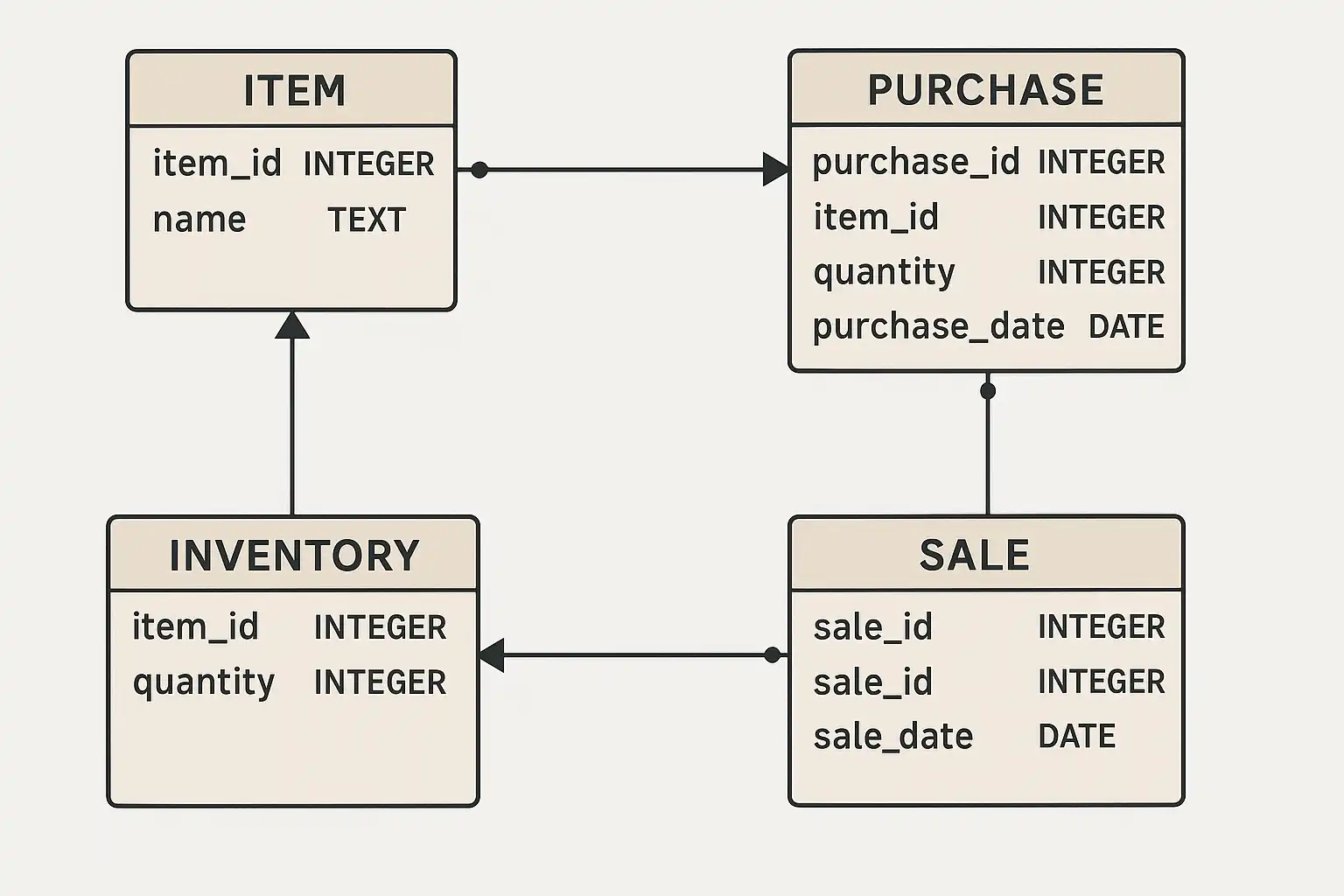 | 采购明细(purchase_detail) | 明细ID, 单号(外键), 商品编号(外键), 数量, 单价 | 与采购订单一对多 |