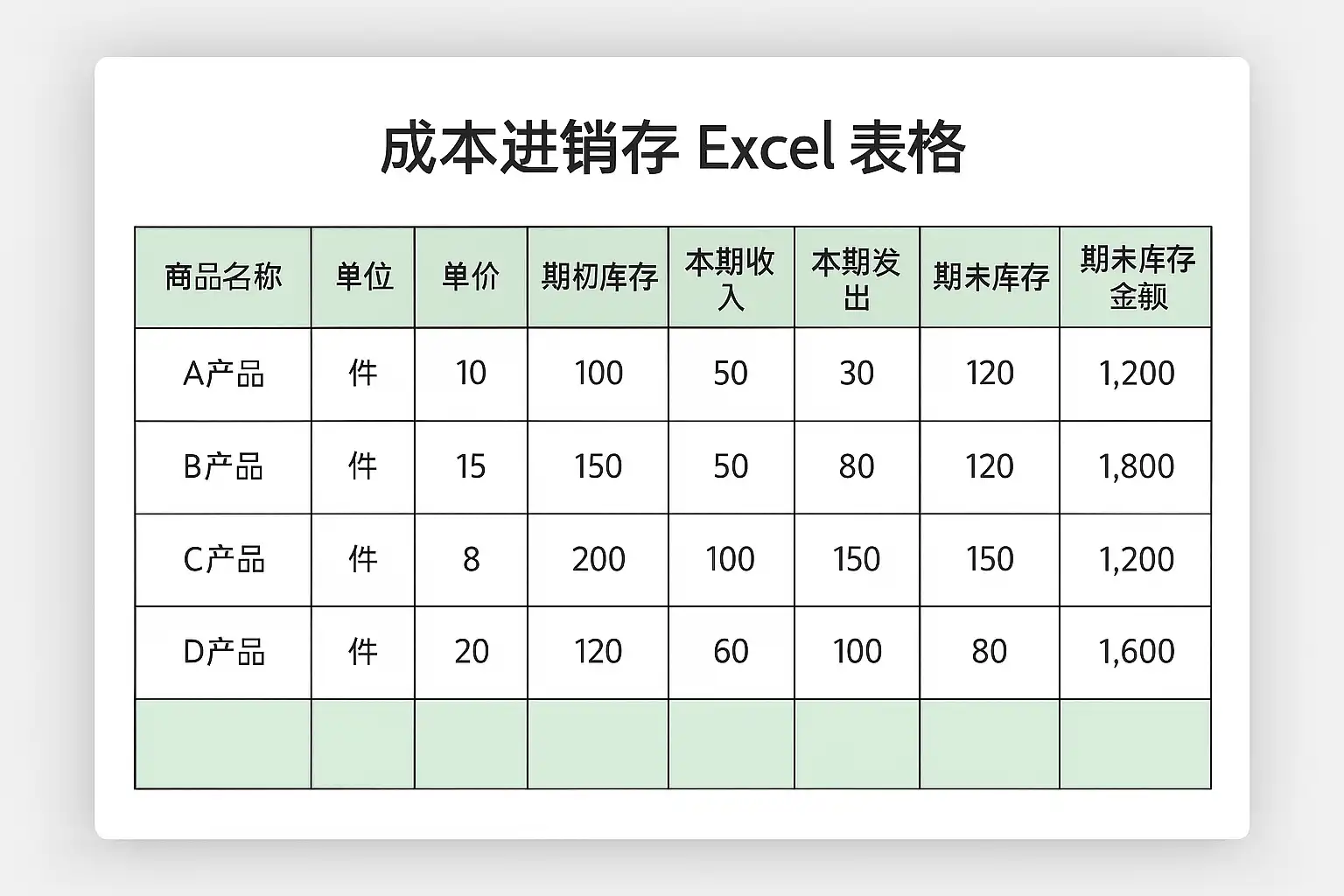 常见的成本进销存Excel表格结构包括:基础信息库(商品信息)、采购明细表、销售明细表、库存流水账和报表统计区。