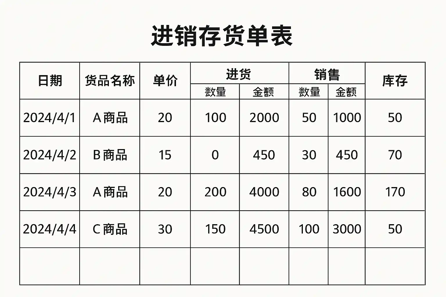 - 明确表格结构:包括商品名称、规格型号、入库数量、出库数量、库存余额等字段。