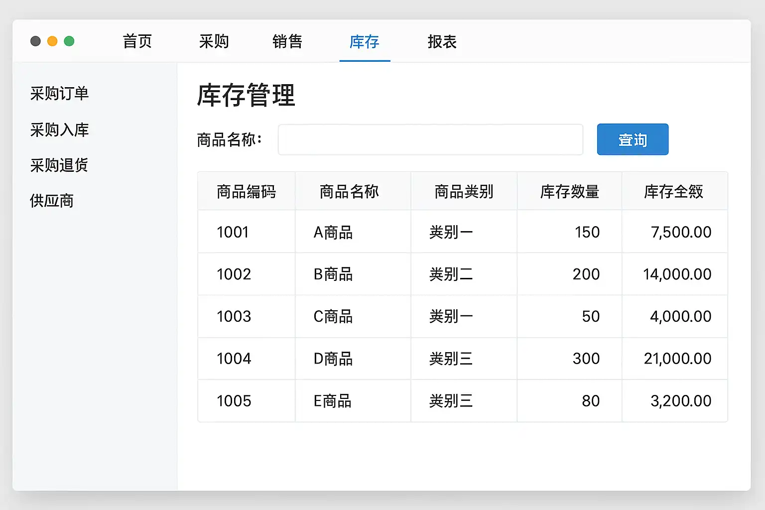 - 库存管理:实时库存查询、库存预警和盘点。