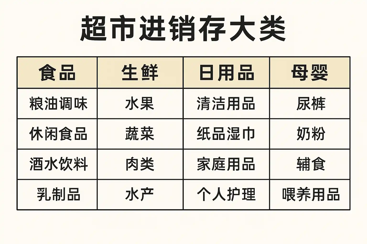 | 1. 按功能性分类 | 根据商品用途划分,如食品、家居用品、个人护理等 | 面包归“食品”,洗发水归“个人护理” |