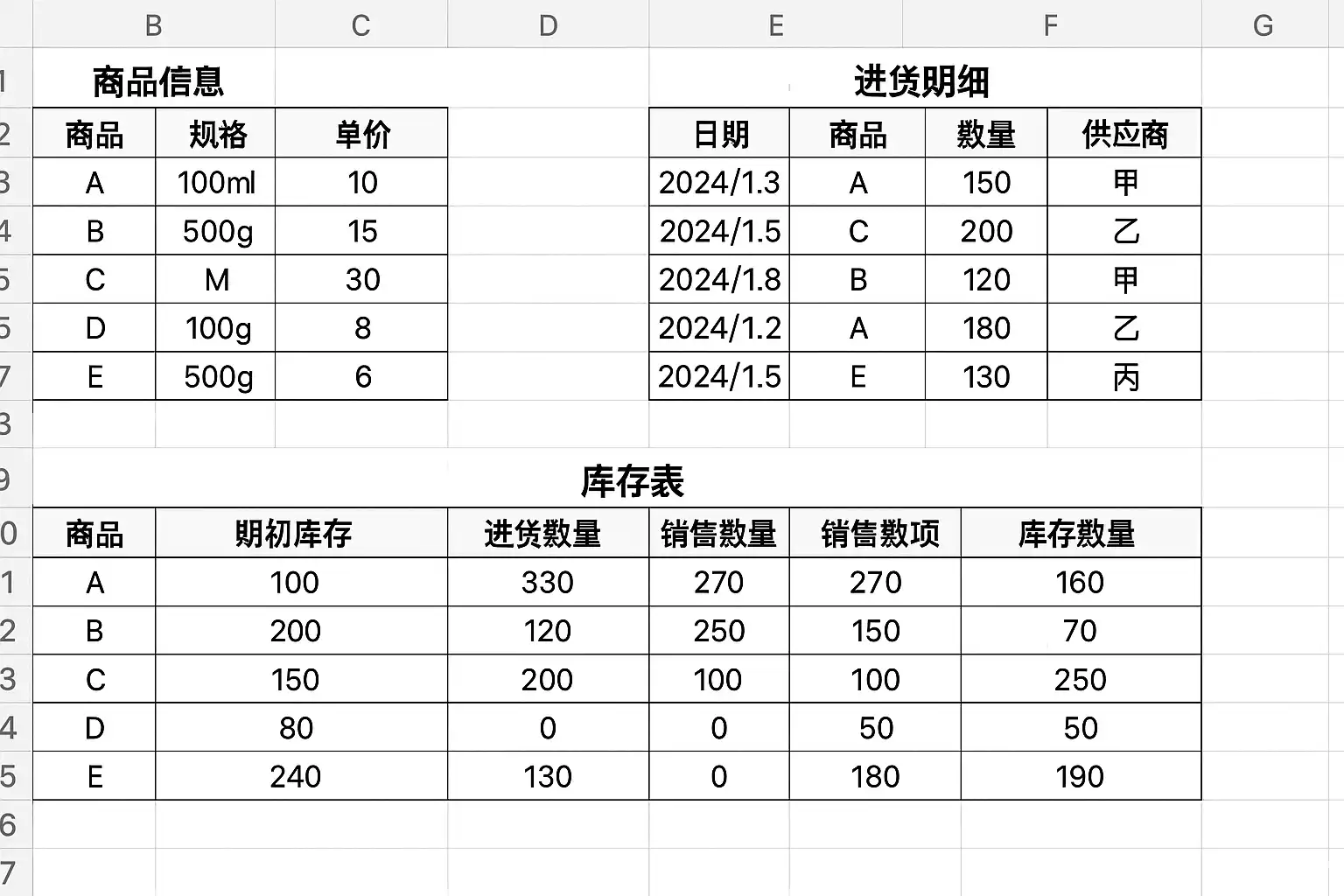 这样,添加新的采购或销售记录后,“库存”表会自动调整对应商品的库存数,大幅减少人工维护成本。