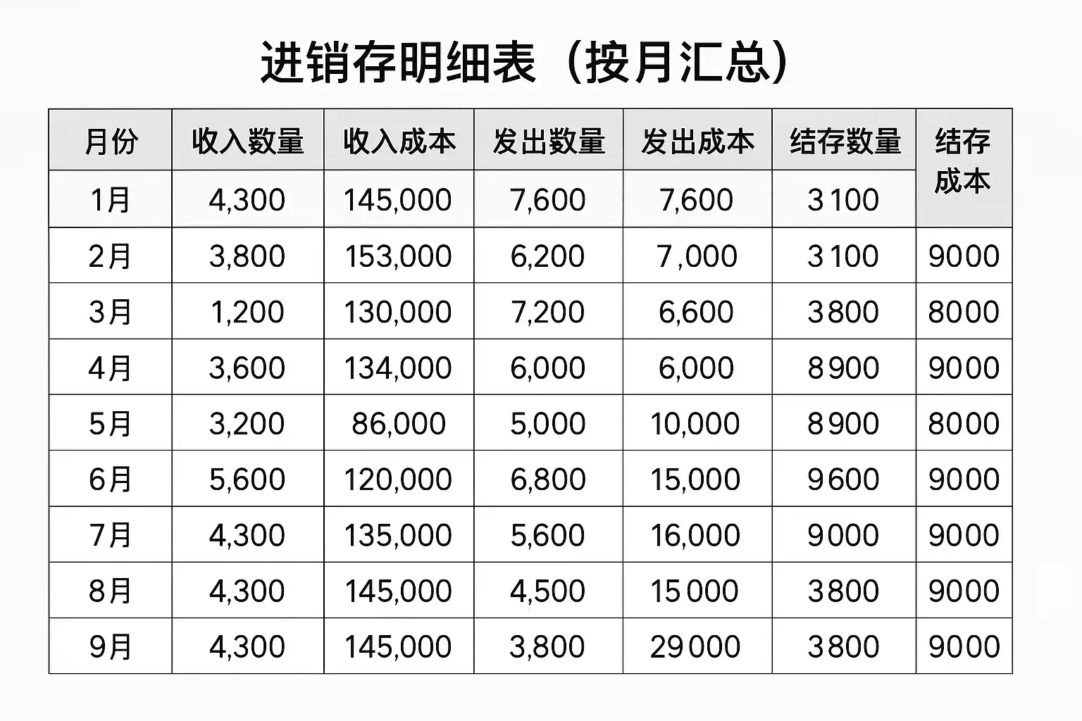 - 月末库存余额 — 衡量库存水平是否合理。