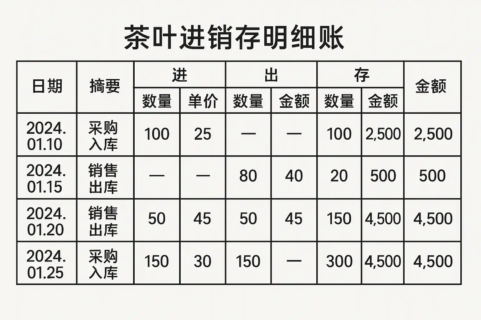 茶叶进销存明细账是指用于详细记录茶叶商品采购(进)、销售(销)以及库存(存)每一笔业务变动的台账。其结构和内容直接关系到企业对物资流转和资金流动的管控能力。一般来说,一份规范的茶叶进销存明细账应包含以下核心字段: