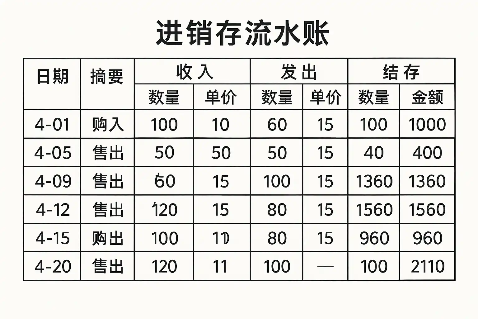 - 按时间顺序登记每笔采购入库和销售出库记录。