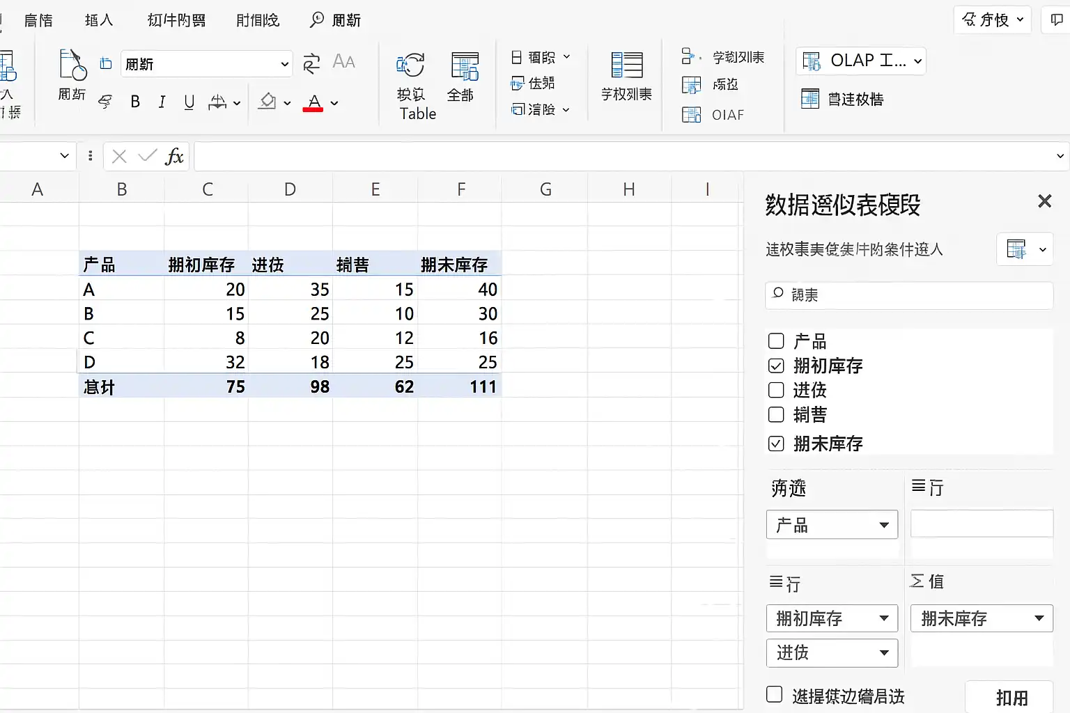 - 添加数值字段:分别将进货数量、销售数量和库存数量拖入数值区域,实现汇总计算。