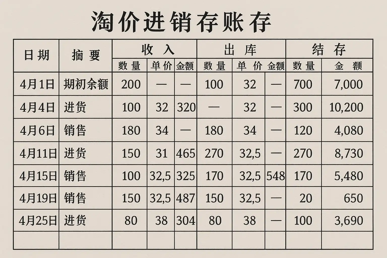 - ‘采购数量’ 和 ‘销售数量’ 列分别记录入库和出库数量。