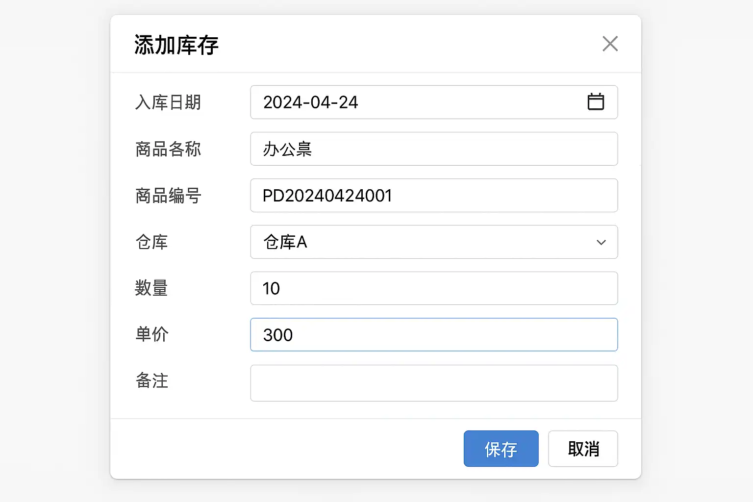 - 库存数量:输入实际入库的数量,建议使用整数单位。