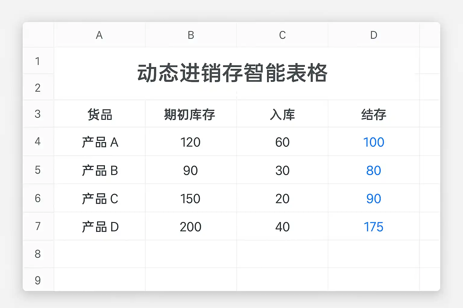 - 利用计算公式,实现“当前库存=初始+累计入库−累计出库”。