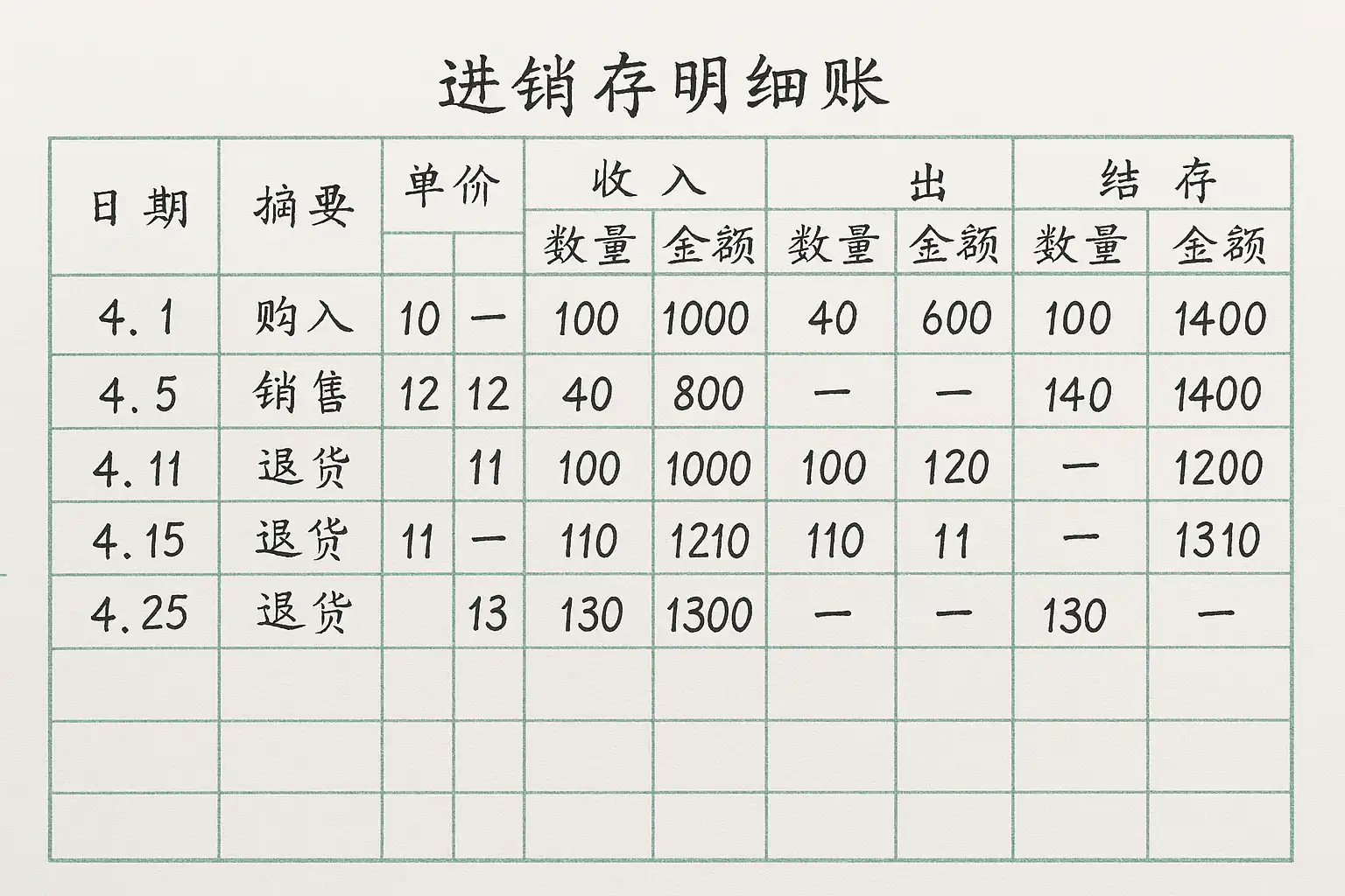 - 更新“结余”栏目,对应调整数量与金额。