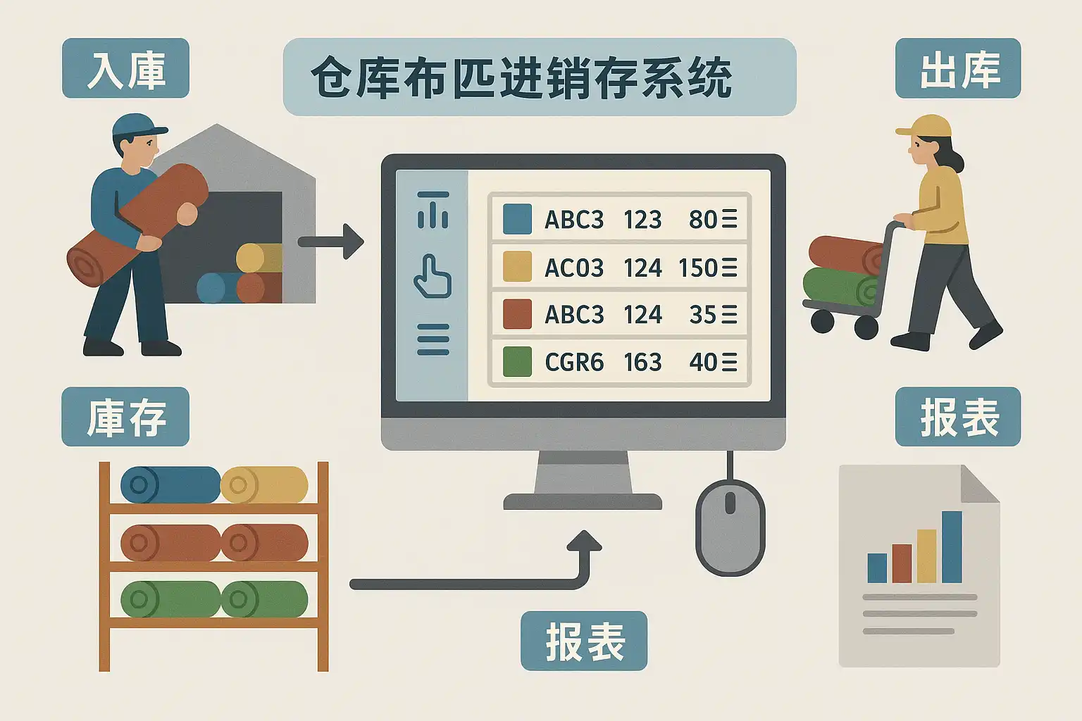 - 接收客户订单→查找可用库存→拣选相应布卷→扫码核对并登记出库数量/去向