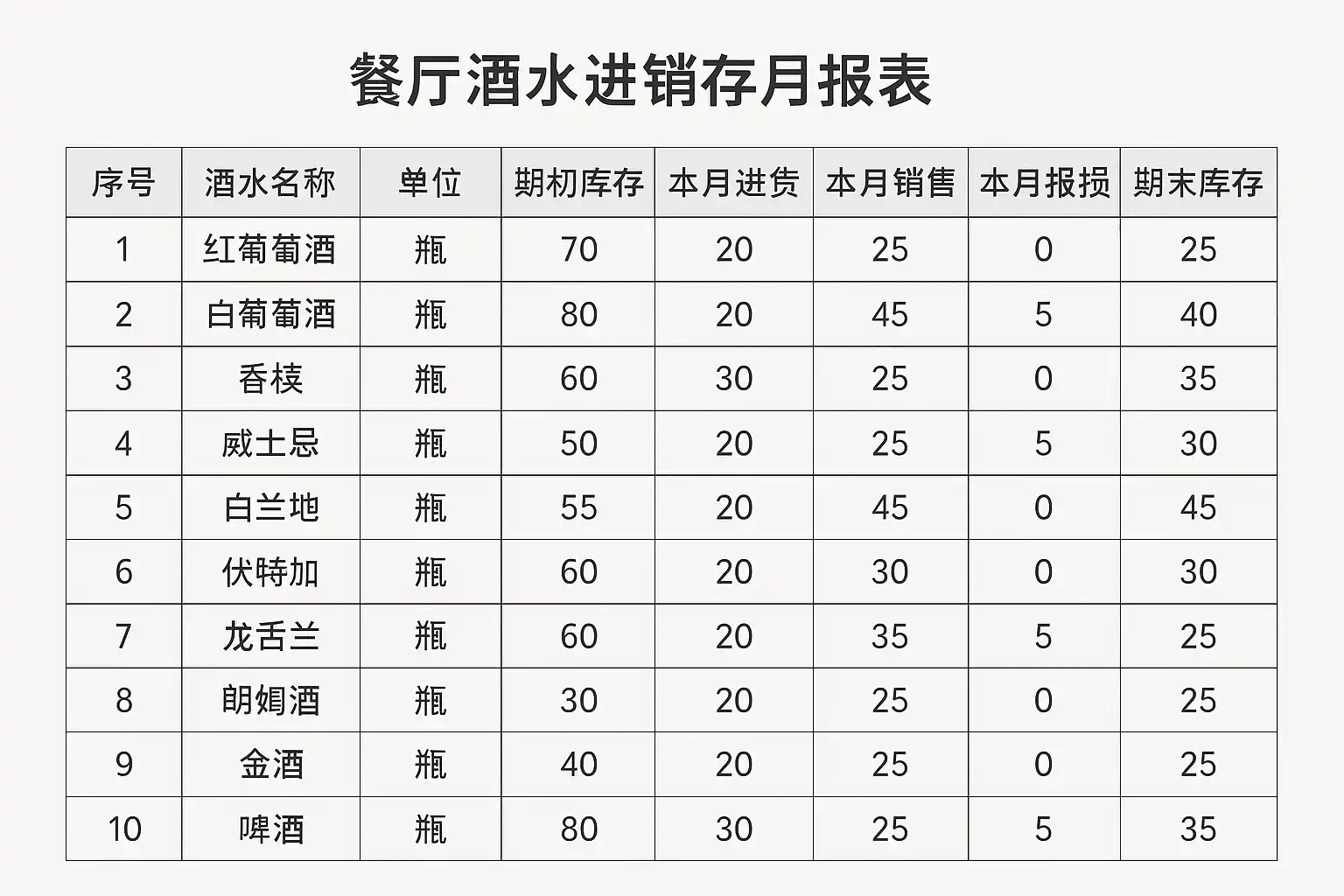| 期末库存 | 月末实际盘点后的各类酒水库存数量及金额 |