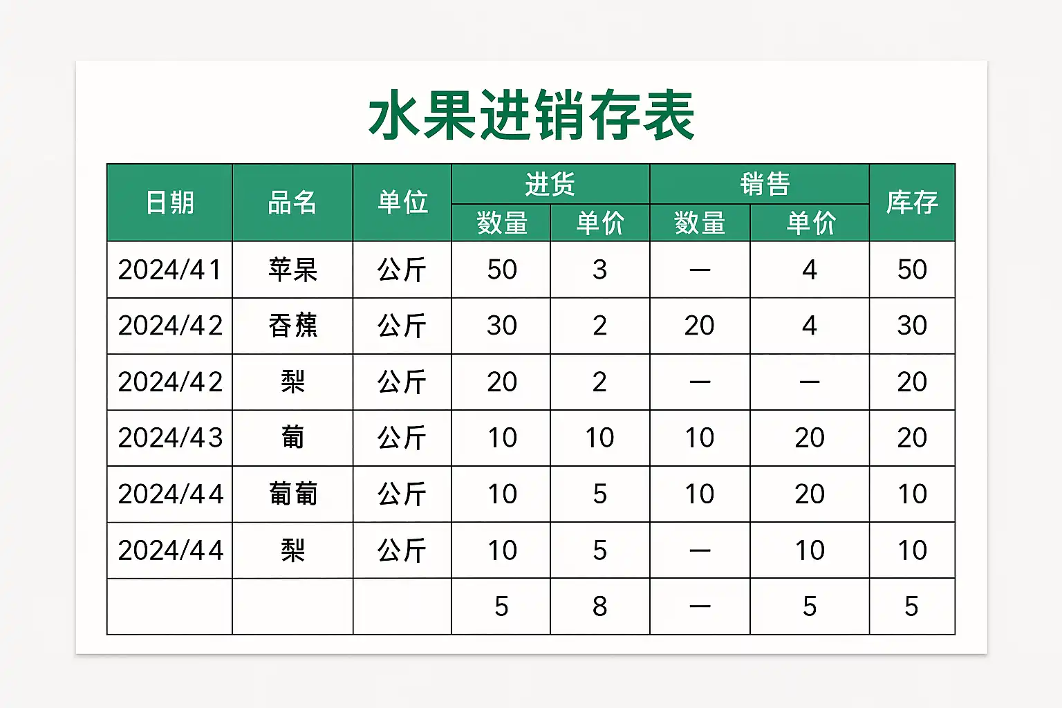 一个完整的水果进销存表模板应涵盖以下关键指标,以保证数据全面且易于分析: