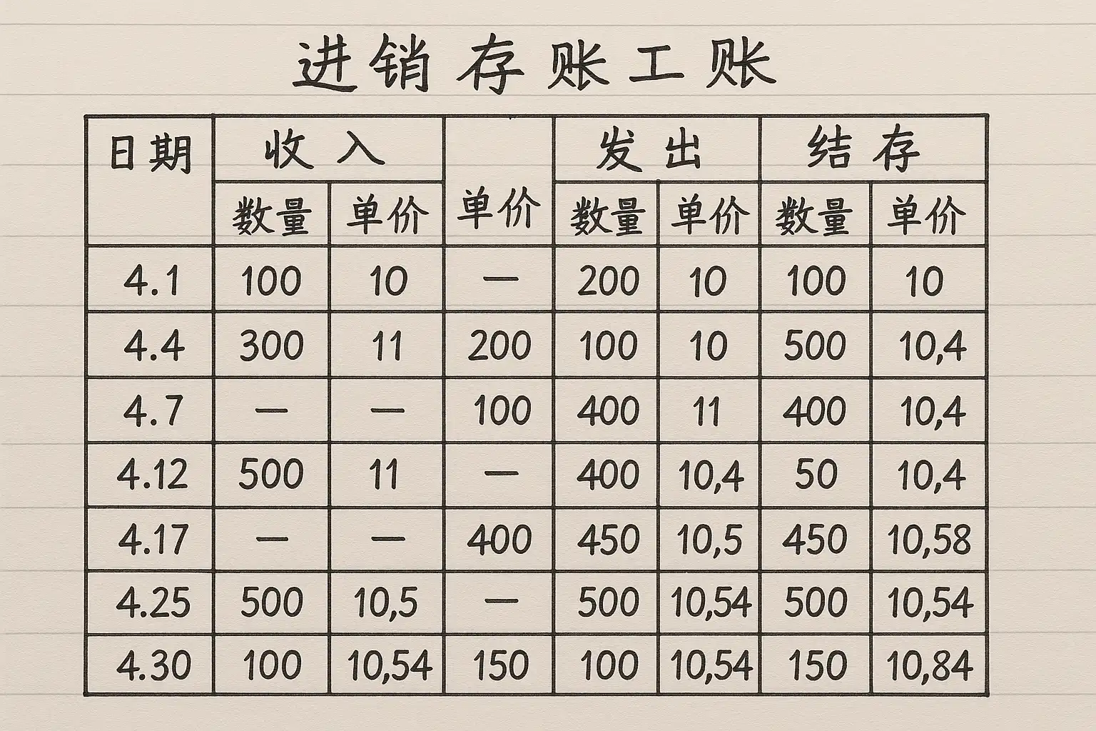 - 按照时间顺序逐笔登记采购数量、销售数量及库存变动。