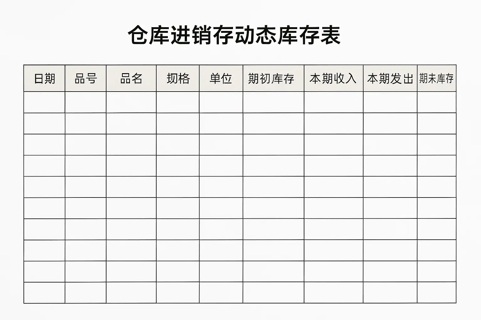 - 每次发生入库业务时,记录日期、单据编号、品名等相关信息,并在“本期入库”栏内增添数量。