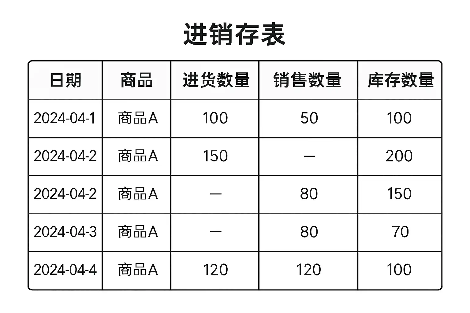 - 每笔采购/销售/库存变更单独成行,有唯一编号标识。