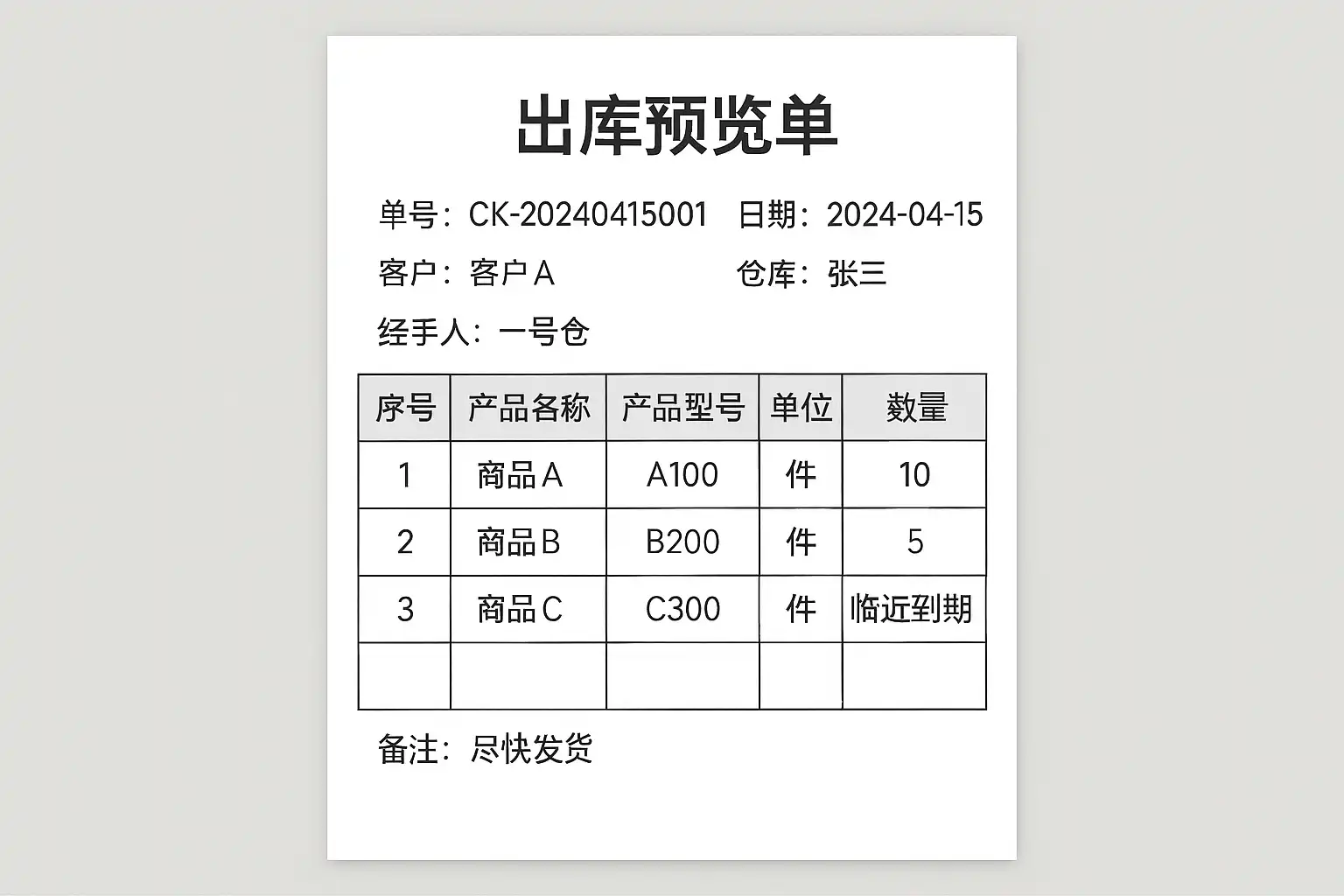 以下为一个基于简道云进销存系统制作的标准“出库预览单”模板示意: