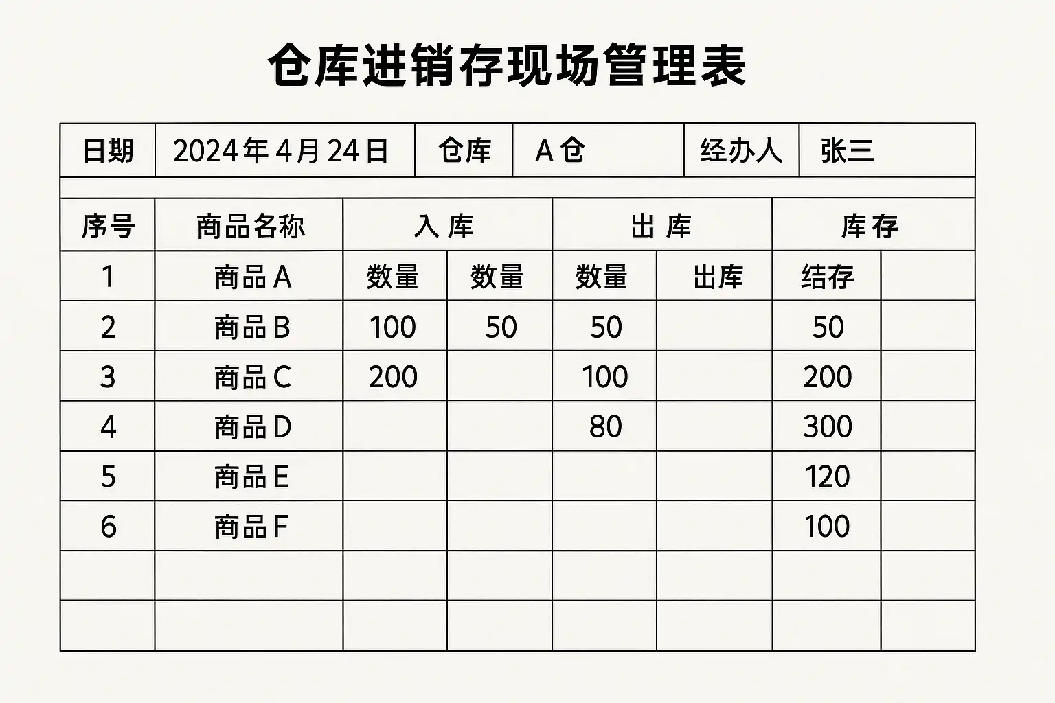 这些项目共同组成了标准的进销存现场管理表格模板,无论是纸质还是电子版本,都应严格按照此结构进行填写。