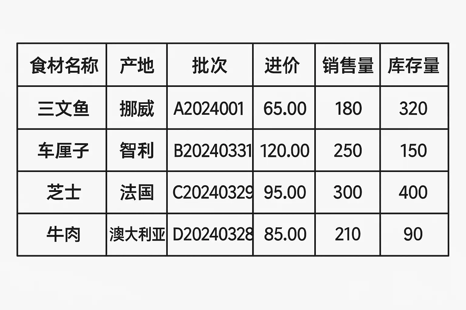 采用结构化表格记录是优化进口食材批次进销存的有效方法。推荐包含以下字段,并按照逻辑顺序排列: