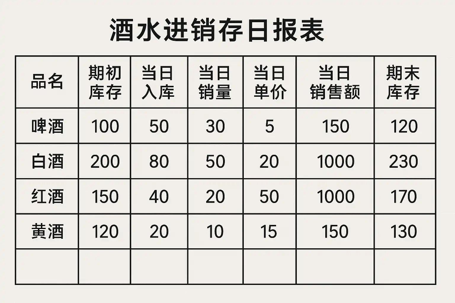 酒水进销存日报表主要目的是反映每日的商品流转及库存变化,便于管理层实时掌控门店或仓库运营状况。其基本结构和计算方法如下:
