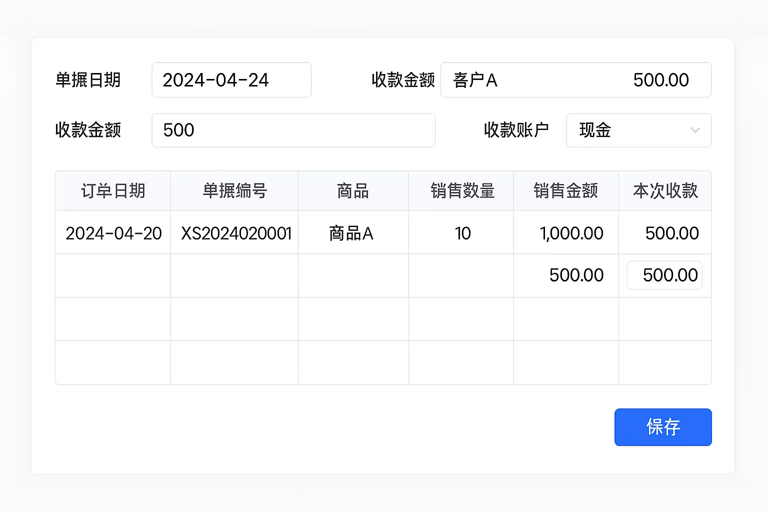 | 部分回款 | 单据明细-分批回款功能 | 系统自动核算剩余未结清部分 |