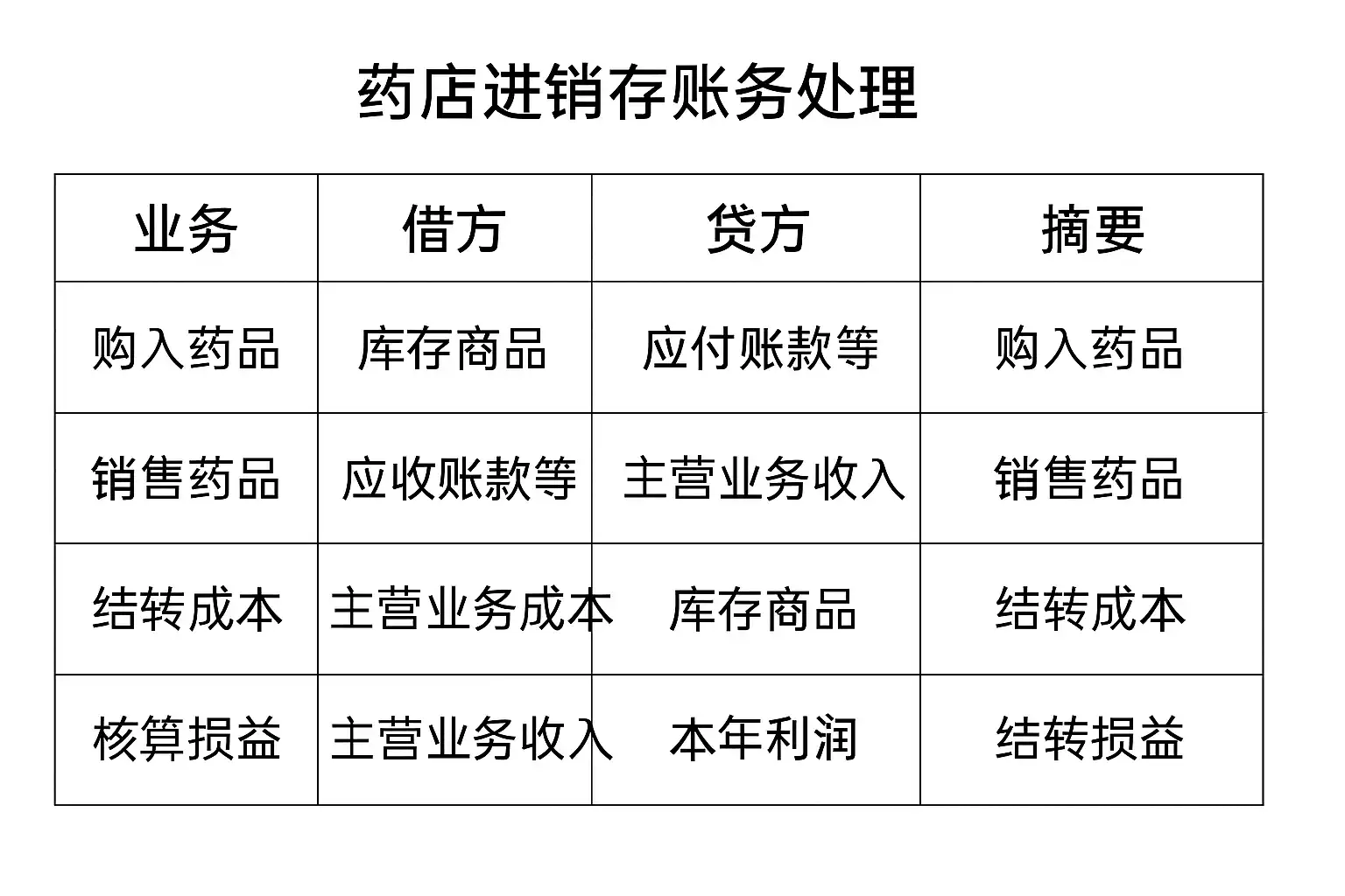 | 药品损耗 | 管理费用-损耗 | 库存商品 | 报废或盘亏调整 |