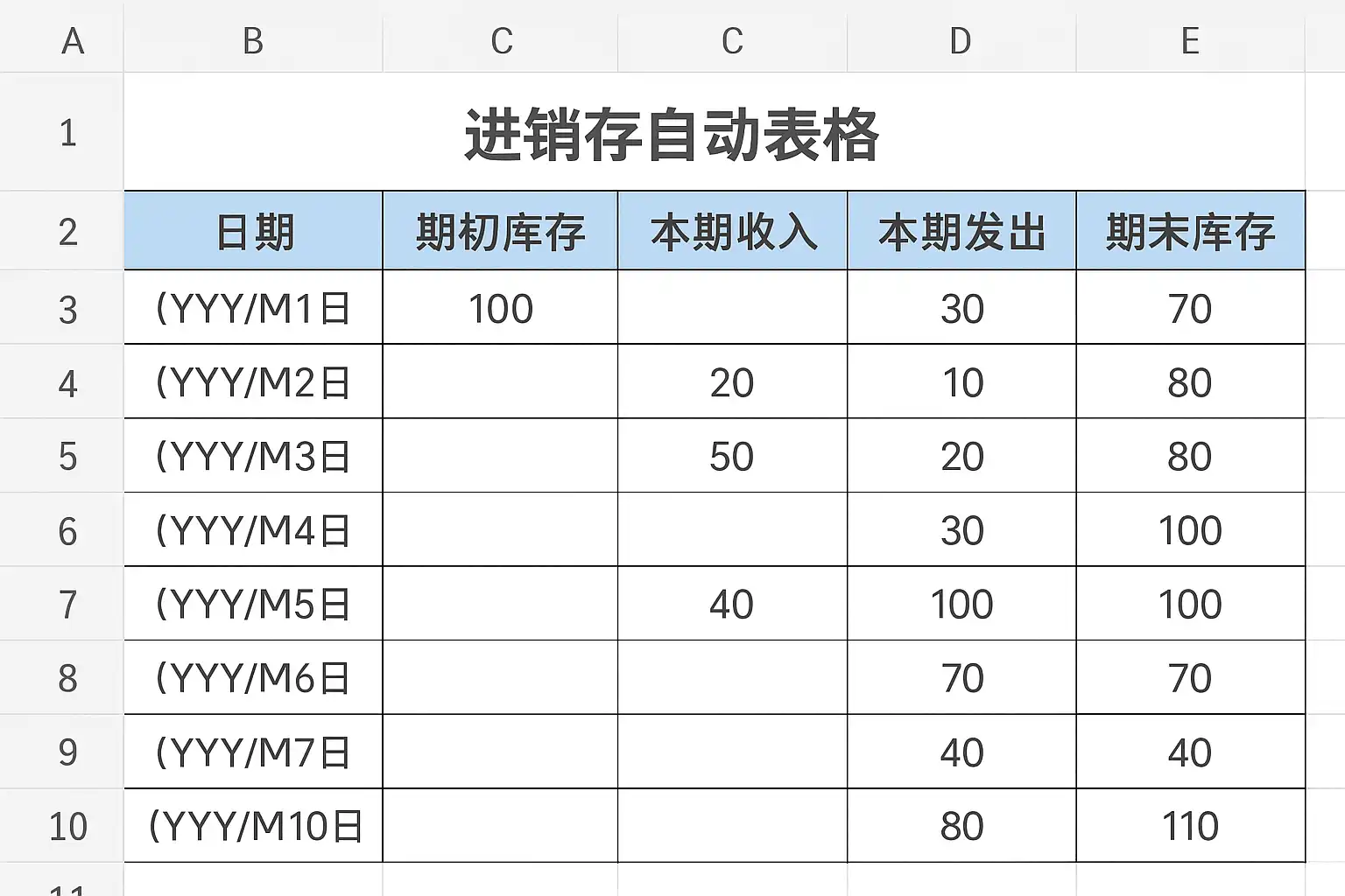 为了让进销存表格具备一定程度的“自动化”,结构设计和公式设置尤其重要。