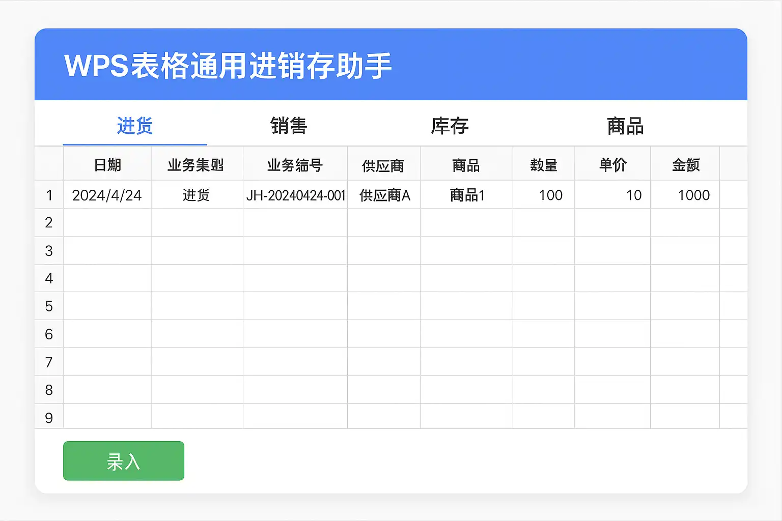 WPS表格作为国内主流的办公软件之一,自带丰富模板和插件工具。其中,“通用进销存助手”结合了日常企业管理对商品采购(进)、销售(销)、库存(存)的需求,通过电子表格实现自动化操作。其核心功能包括: