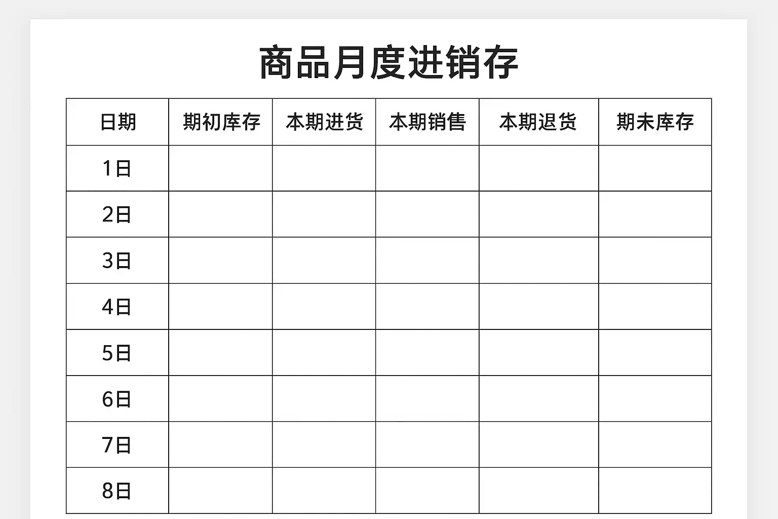 | 商品编码 | 商品名称 | 单位 | 期初库存 | 入库(本月) | 出库(本月) | 期末库存 |