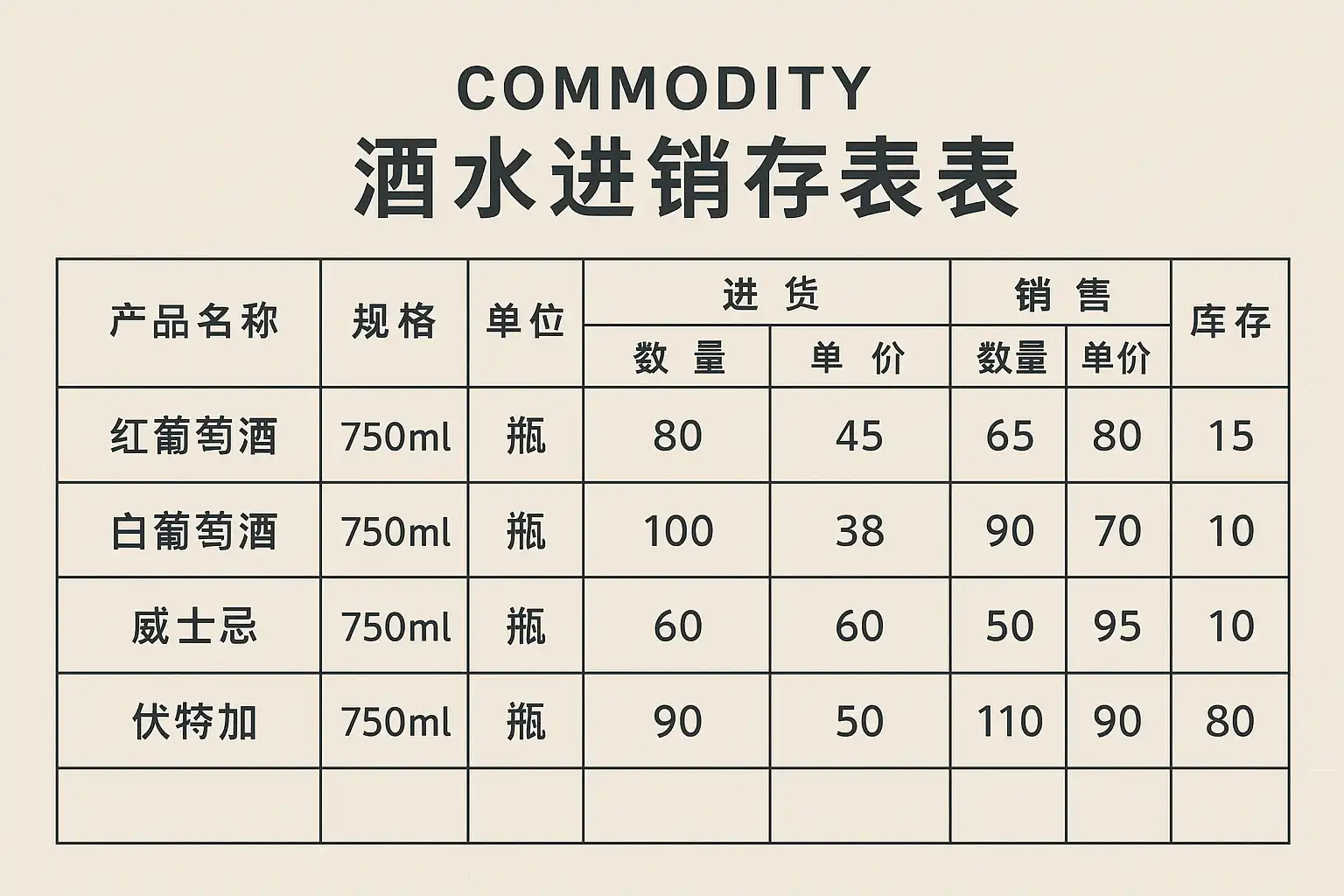 - 利用条件格式突出库存警戒线(例如库存低于10瓶时变红)。