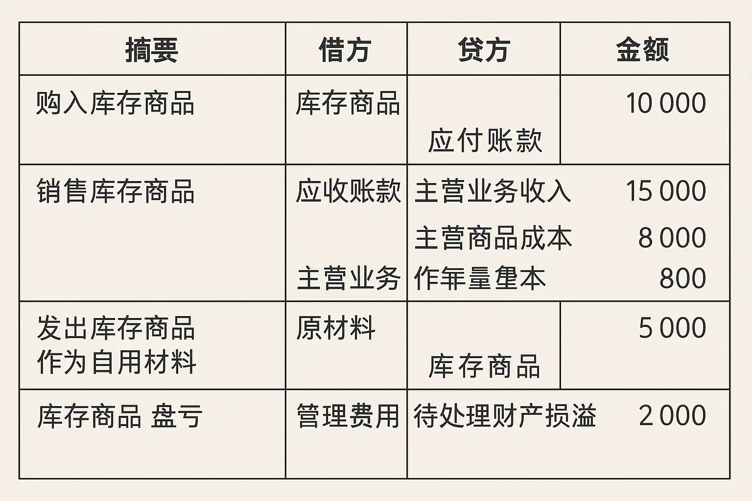 此表格简明扼要地展示了从采购到销售再到盘点调整各个关键节点所需完成的会计记录,使得财务人员能够规范、高效地完成日常工作。</div></div>