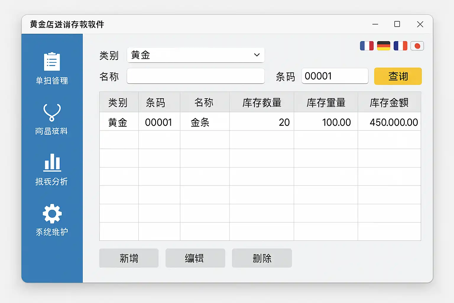 | 库存监控 | 实时显示各类金饰数量及总重,动态提醒低库存/超储风险 |