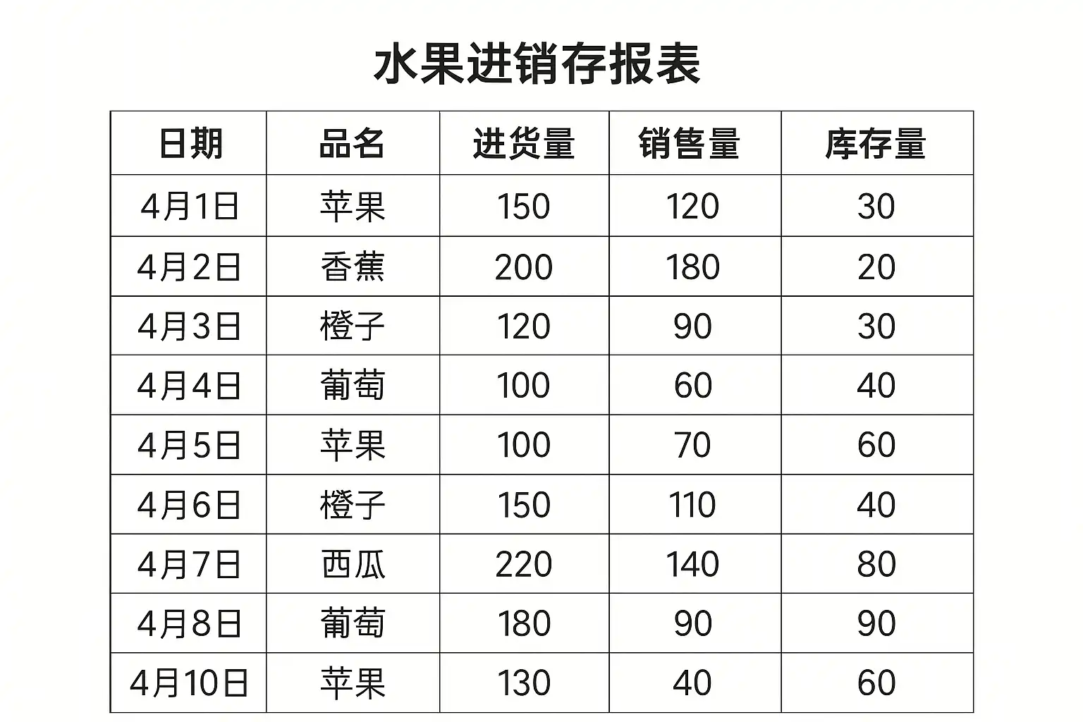 水果进销存报表主要包括三个核心部分:采购入库、销售出库和库存盘点。一般结构包含商品名称、规格、数量、单价、总金额以及时间节点。例如: