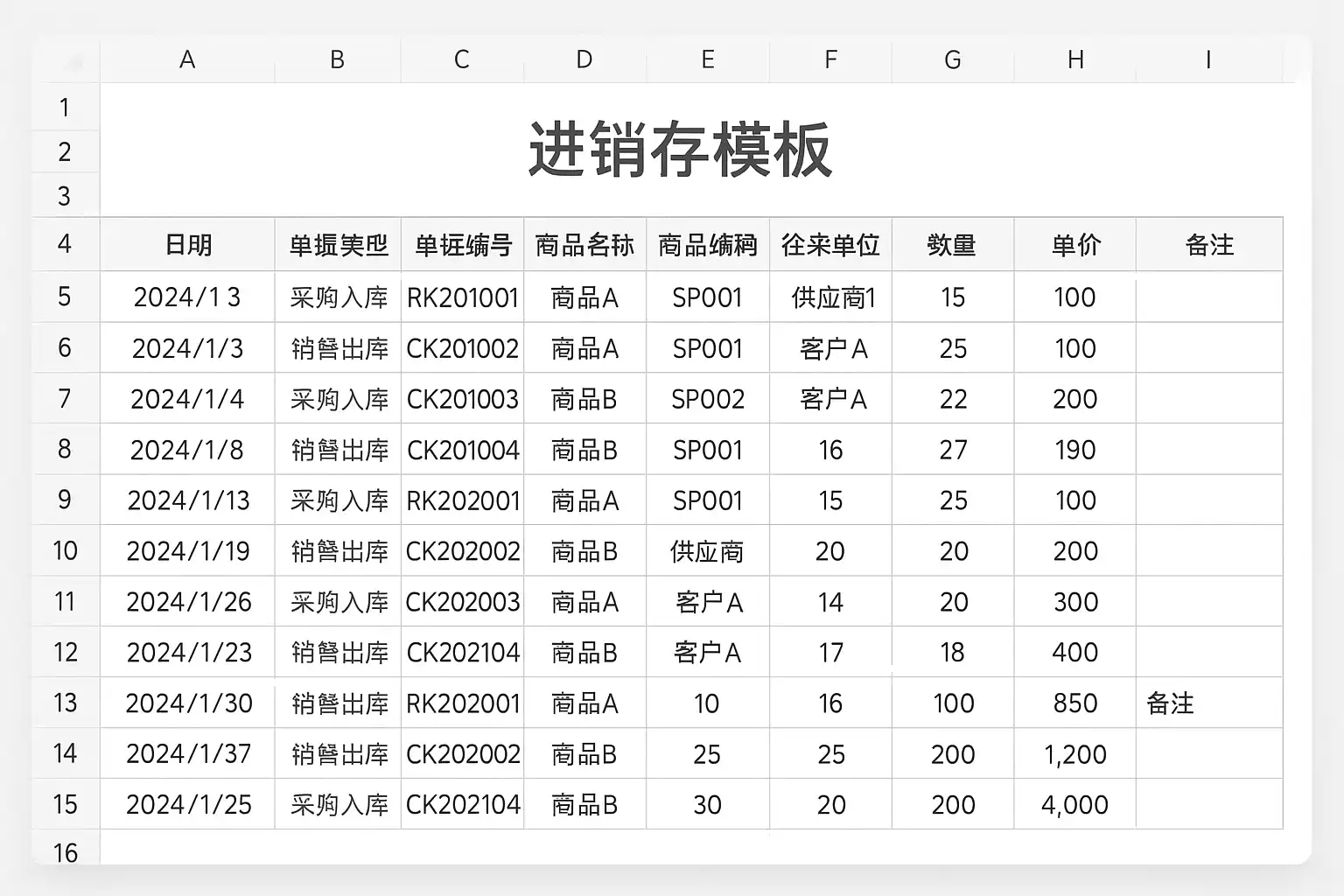 大多数WPS提供的进销存Excel(.xls/.xlsx)模板结构如下: