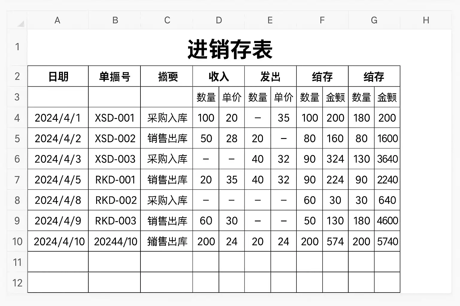 | 商品编号 | 商品名称 | 规格型号 | 单位 | 单价 | 日期 | 入库数量 | 出库数量 |