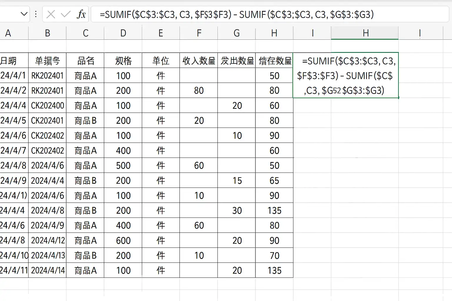 库存余额 = SUMIFS(入库范围, 商品范围, "指定商品") - SUMIFS(出库范围, 商品范围, "指定商品")
