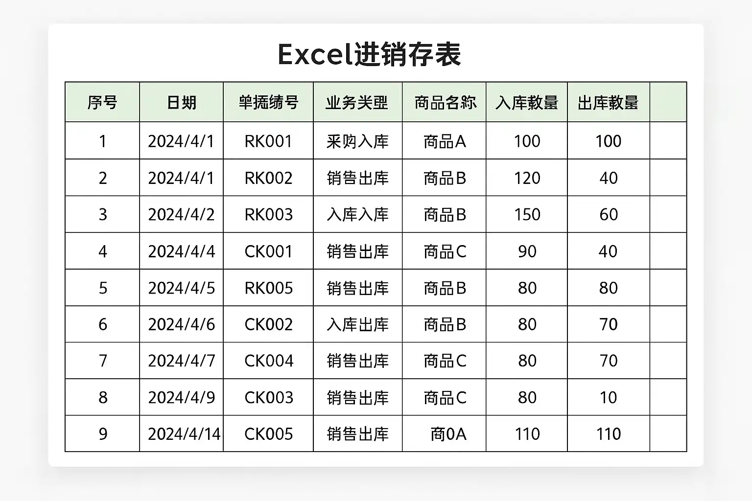 | 商品编号 | 商品名称 | 单位 | 入库日期 | 入库数量 | 出库日期 | 出库数量 | 库存结余 |