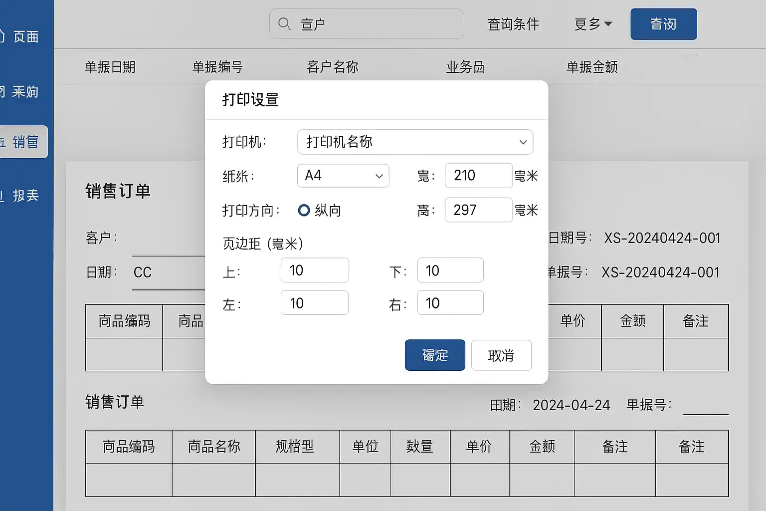 纸张规格与布局 根据实际需要选择A4/A5/80mm小票纸等规格,并设定横向纵向排版。