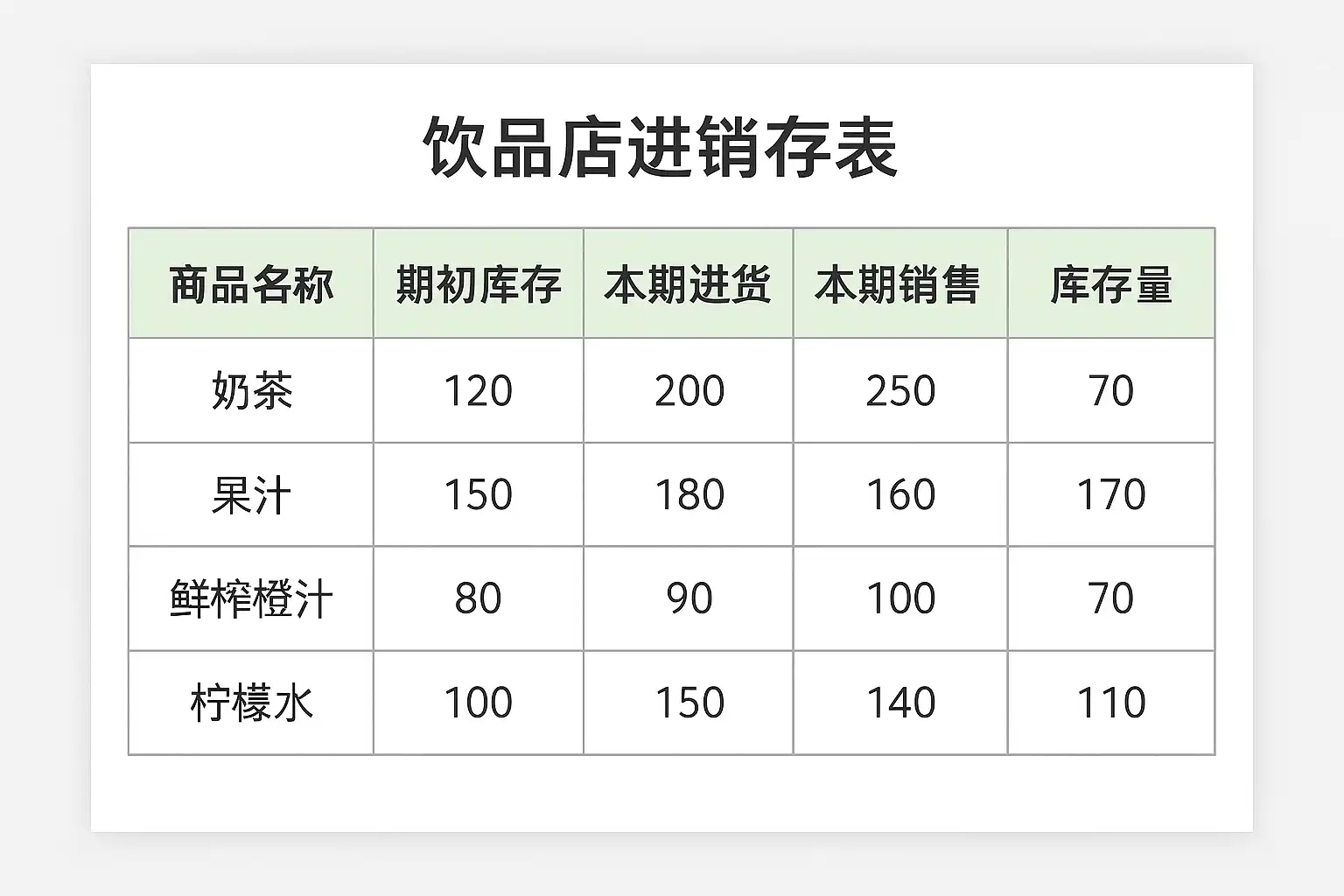饮品店的经营特点决定了其进销存管理需要兼顾多样化原材料采购(如茶叶、水果、糖浆)、高频次小批量销售及易损耗属性。因此,在Excel中建立适用的进销存系统时,必须满足以下核心需求: