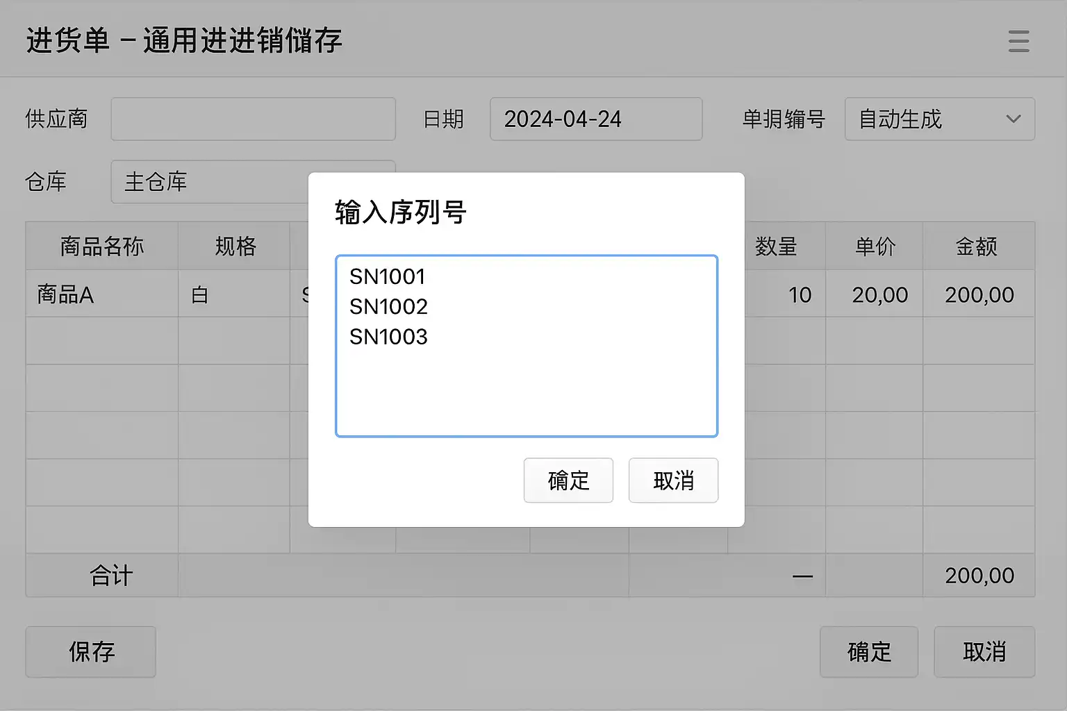 - 确认无误后保存,系统将自动绑定序列号与库存批次。