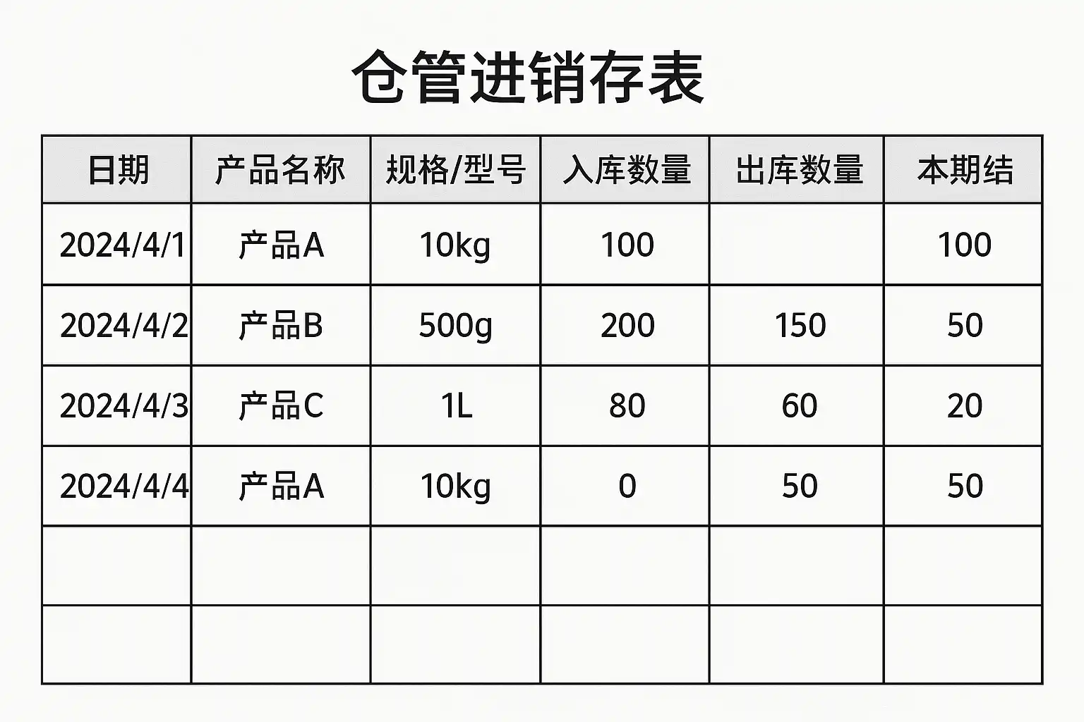 | 日期 | 单据类型 | 商品编码 | 商品名称 | 规格型号 | 单位 | 入库数量 | 出库数量 | 单价 | 金额 | 库存结余 |
