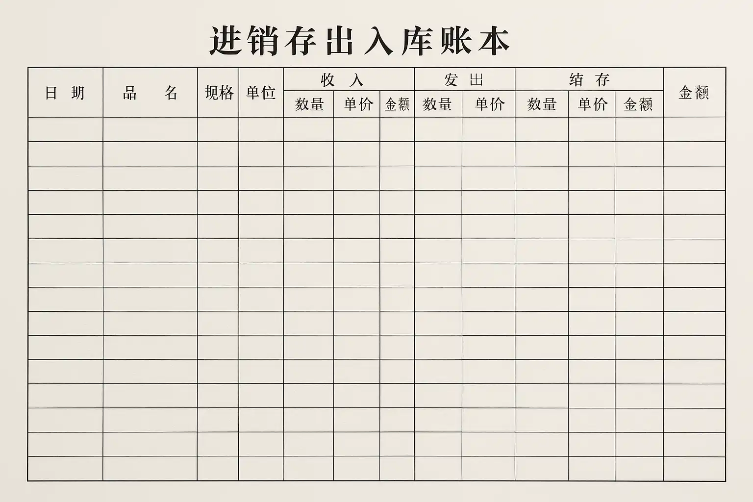 | 日期 | 单据编号 | 商品名称 | 规格型号 | 单位 | 入库数量 | 出库数量 | 单价 | 金额 | 结余数量 |