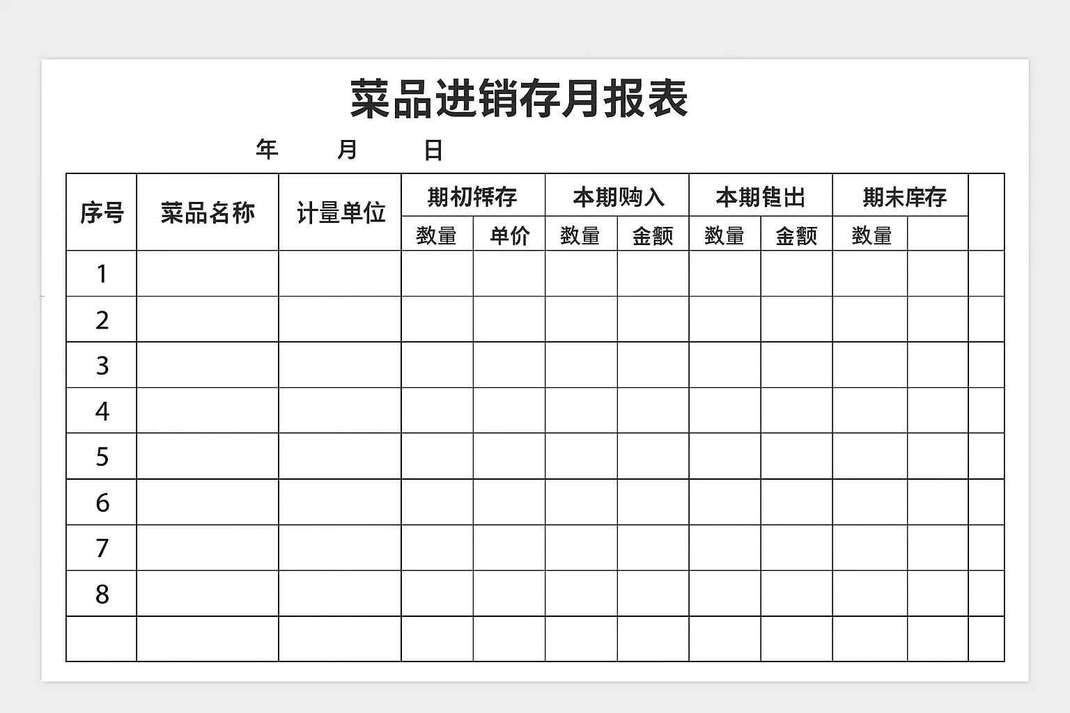 填写菜品进销存月报表时,需依次记录“期初库存”、“本期采购”、“本期销售”和“期末库存”四大核心数据。具体步骤包括: