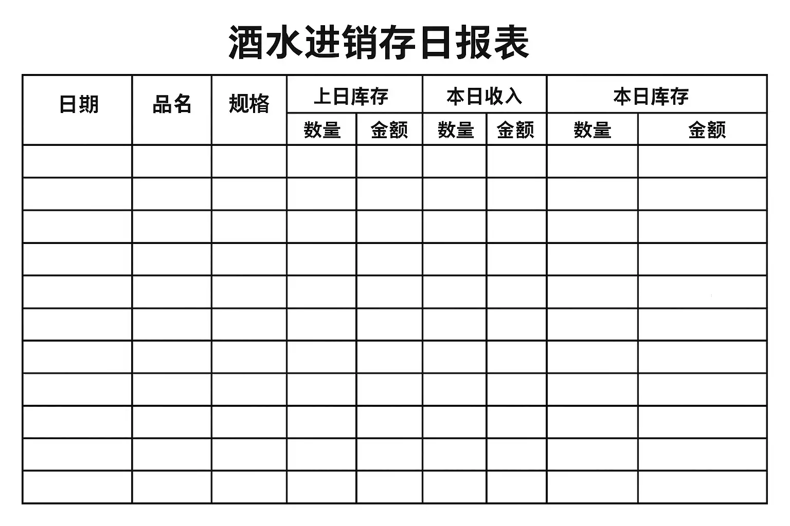 酒水行业的进销存管理需细致记录每一笔业务流转。日报表作为日常运营的数据基础,其结构通常包括以下几部分: