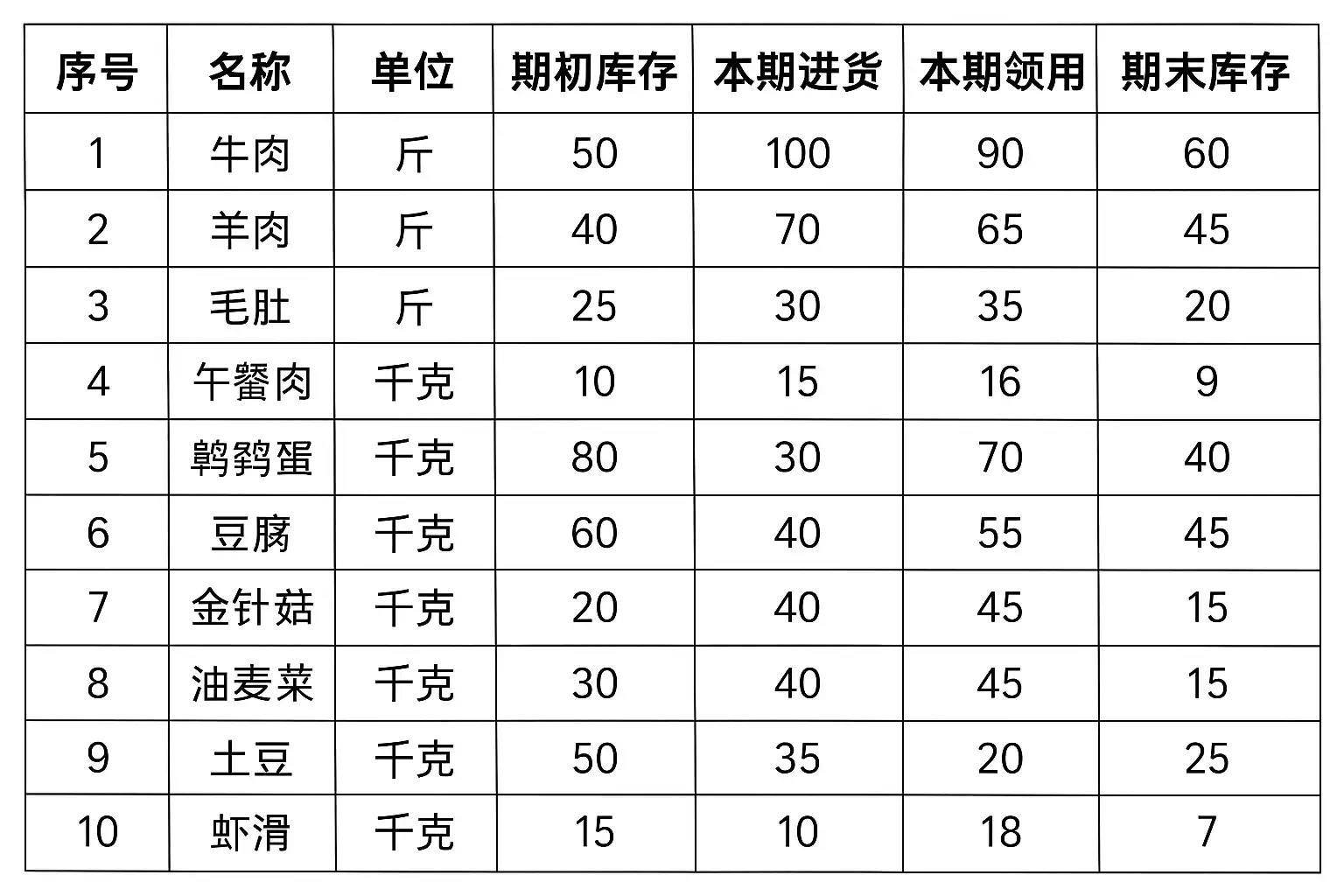 | 库存盘点 | 当前库存量及日期 | 牛肉片, 5kg, 2024-06-01 |
