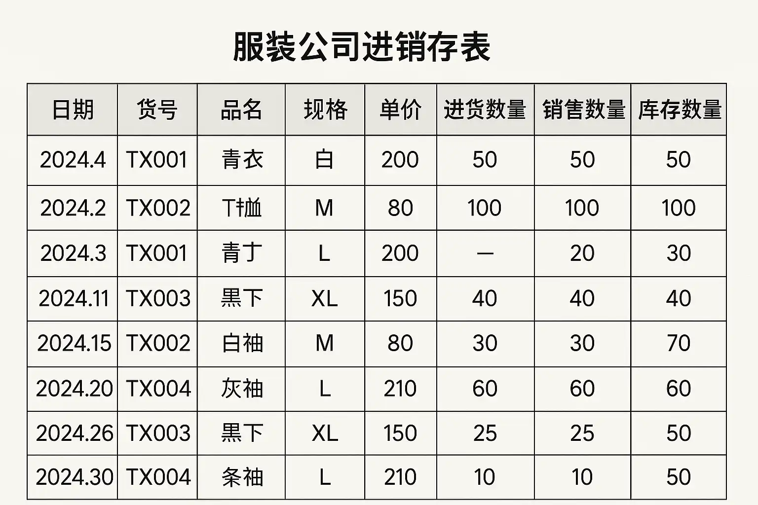 | 2024-06-01 | M202401001 | 男士T恤 | 100 | ¥80 | ¥8000 | XX纺织 |
