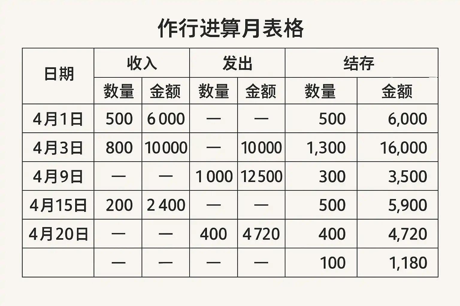 日期 | 品名 | 单位 | 上期结存 | 入库 | 出库 | 本期结存 :---:|:------:|:---:|:--------:|:----:|:----:|:---------: 6/1 | 手机壳A | 个 |100 |50 |30 |120 6/15 | 手机壳A | 个 |120 |20 |40 |100 6/30(盘点)| 手机壳A|个|100 |- |- │100