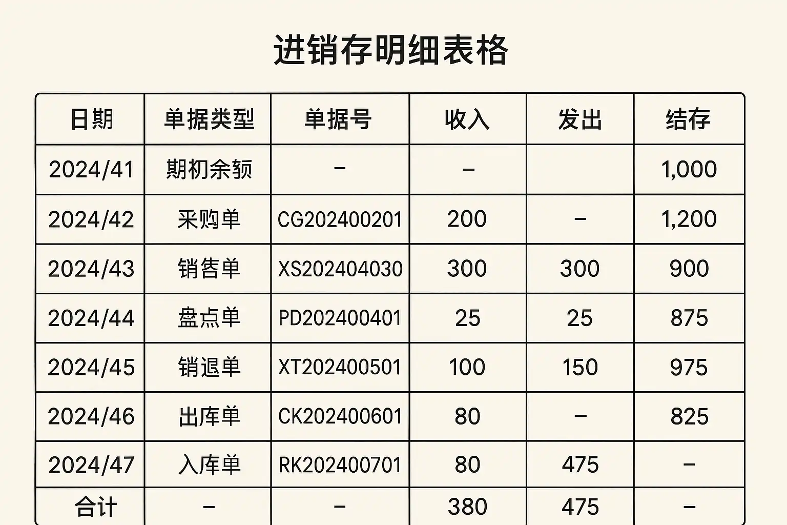 - 库存余额:动态显示当前库存水平(库存余额 = 上期库存 + 入库 - 出库)。